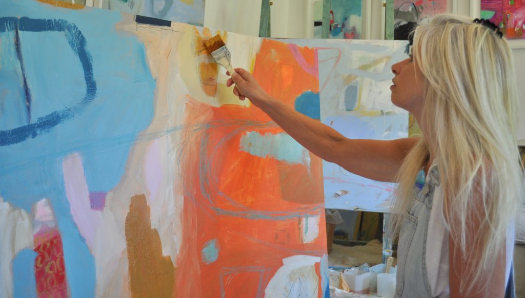 Diane Whalley is a self-taught contemporary abstract artist, based in Cornwall. She creates, photographs and designs intuitively from both personal reflections and the imagination. After graduating with a BA (hons) degree in Graphic Design from Liverpool School of Art and Design, Diane began her career in media and public relations. It was several years later, after becoming a mother to two children, that she rediscovered her love for art and design. During these first few years, Diane enjoyed working with textiles – creating and selling quirky and colourful pictures. Sadly, not long afterwards, a loss in the family led Diane and her children to find a new home in the small Cornish seaside town of Fowey. The next few years, spent exploring both the beautiful Cornish coastline and the tiny islands of the Mediterranean, influenced a major transformation in Diane’s work. The vibrancy of these experiences inspired her to explore acrylic painting – an evolution characterised by contemplation, reflection, experimentation and expressionism. In 2016, Diane established her garden studio and contemporary gallery at her home on the outskirts of Fowey and continues to draw inspiration from the surrounding countryside and landscape.